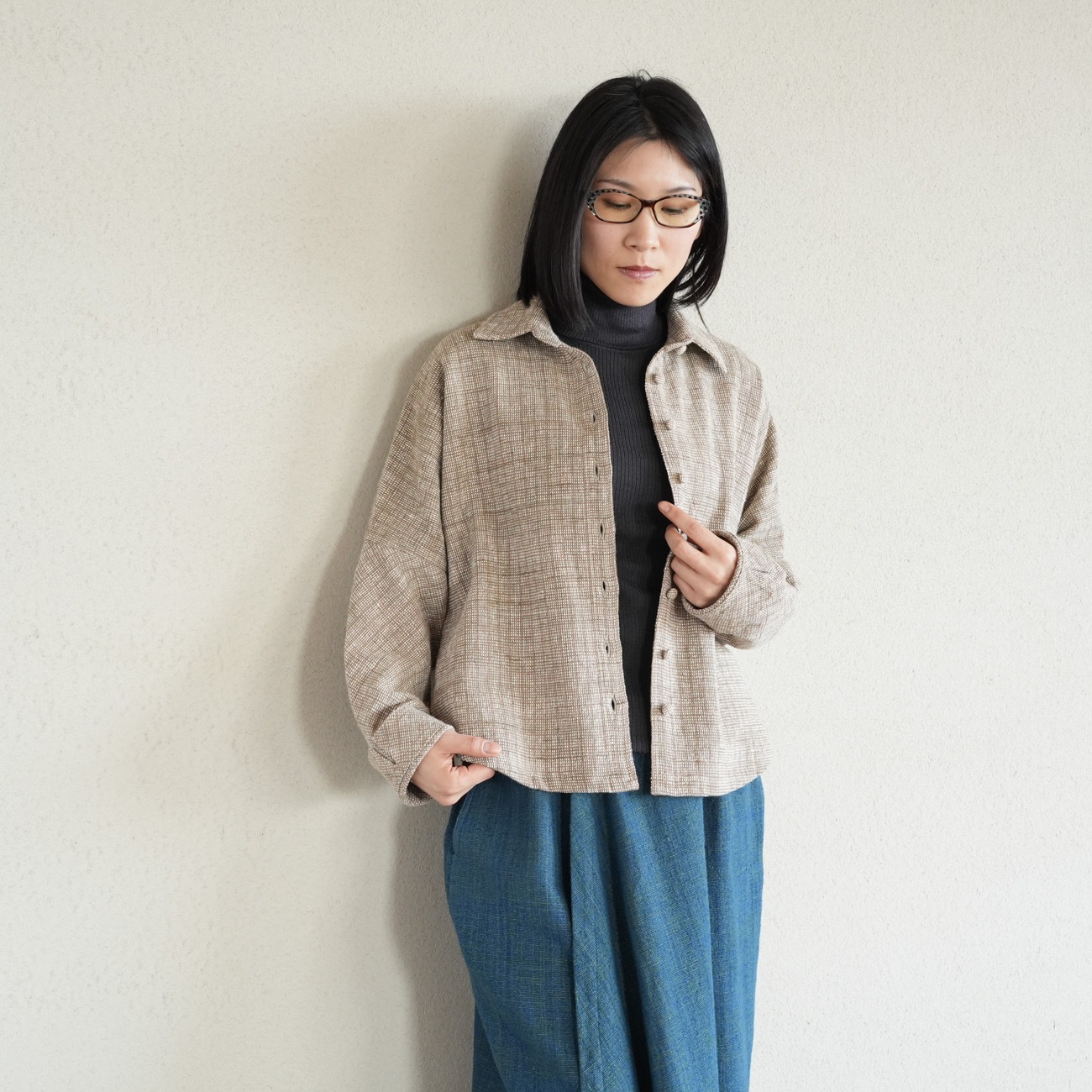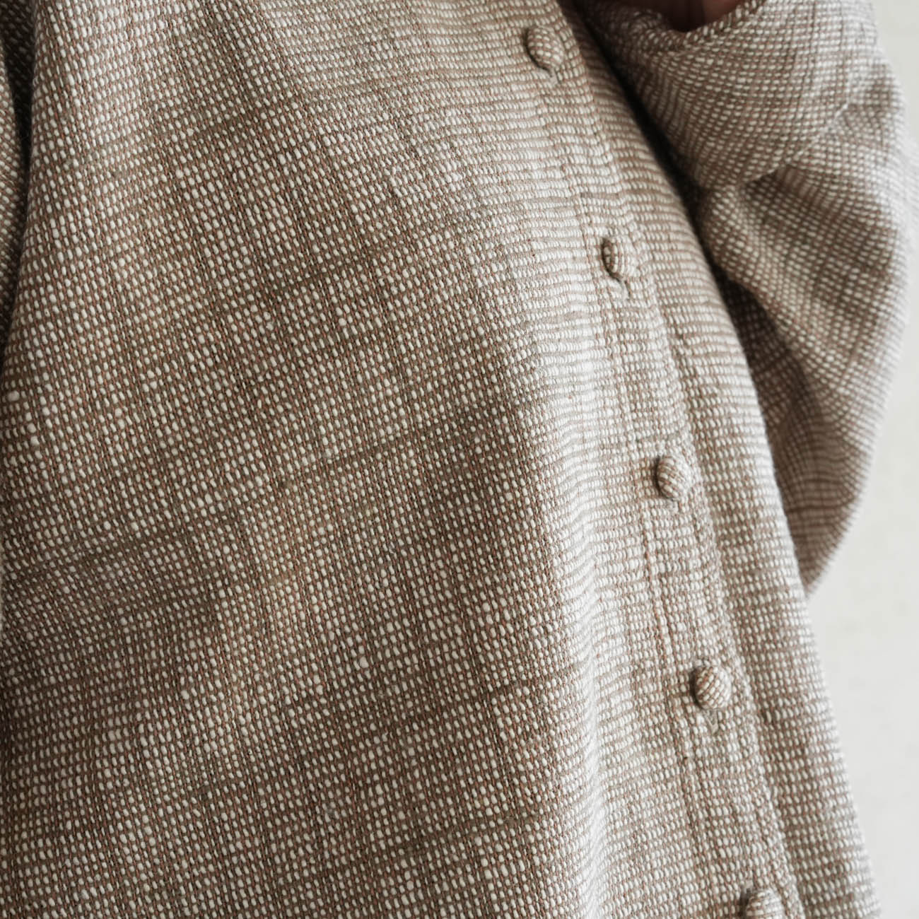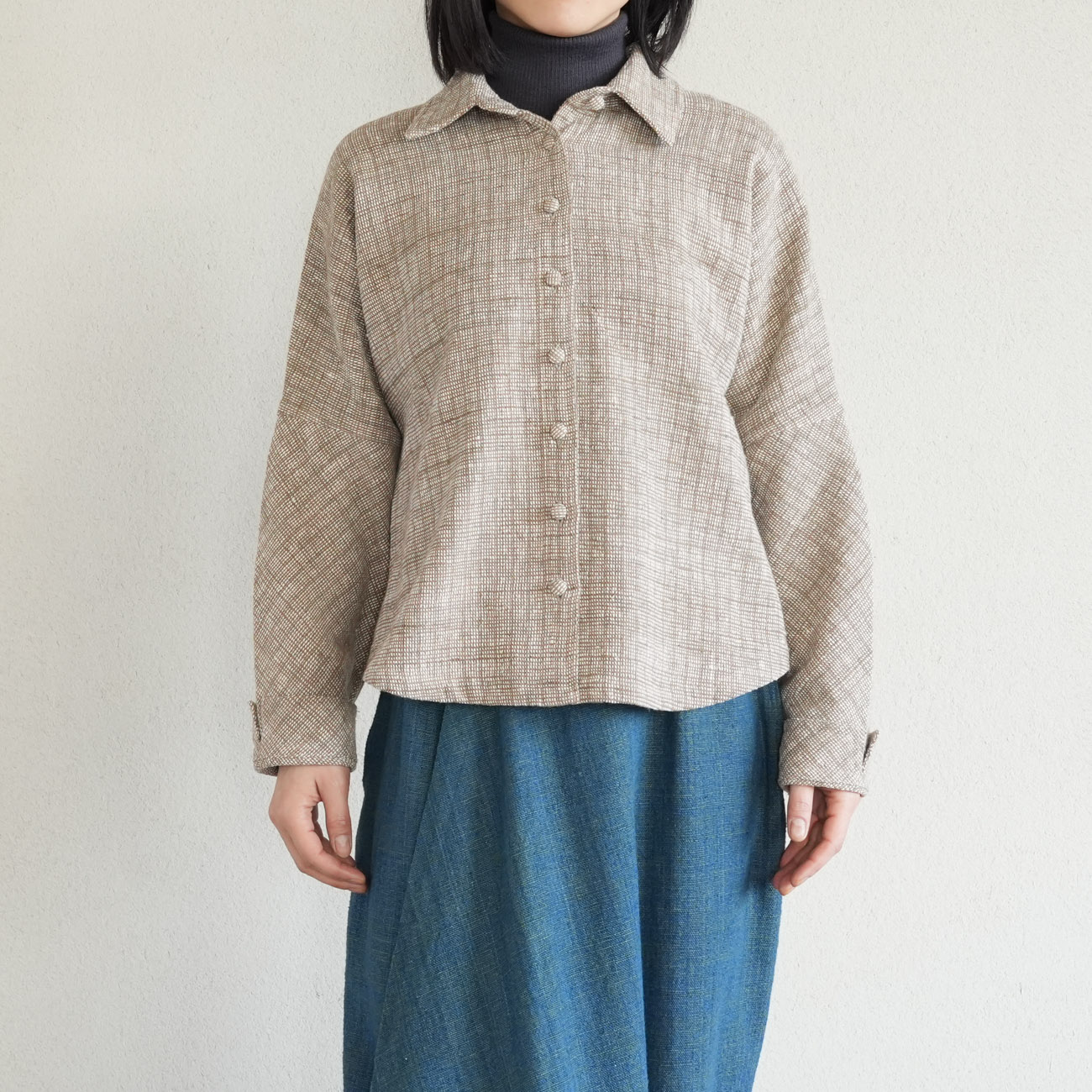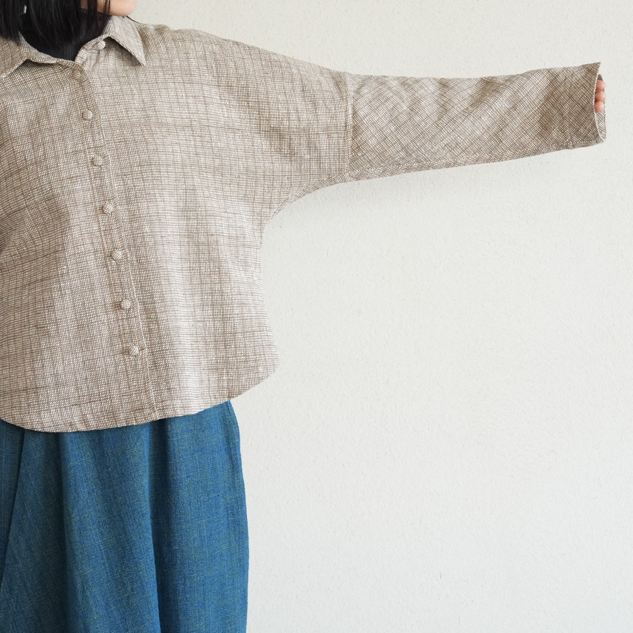 フロントのくるみボタンを閉じてシャツのように着たり