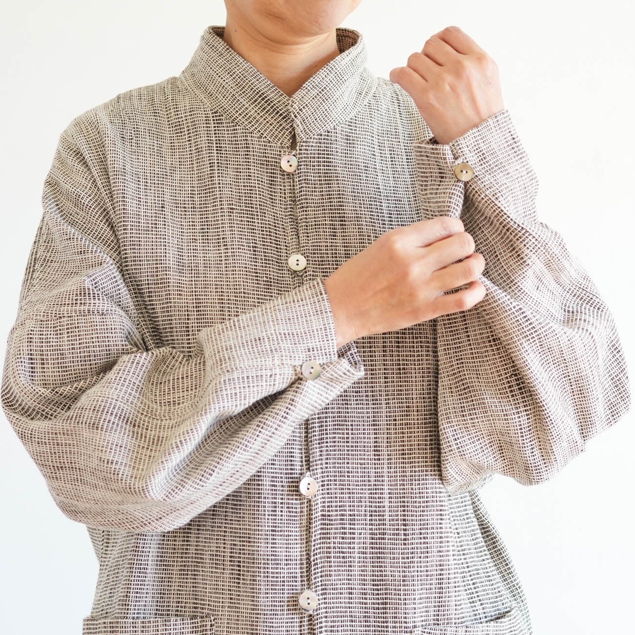 中央に並んだ貝ボタンとボタンループ
