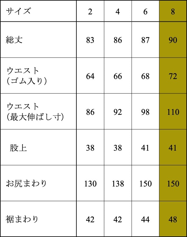 ・ウエスト(ゴム入り)は全く伸ばさずそのままの状態で採寸しています。