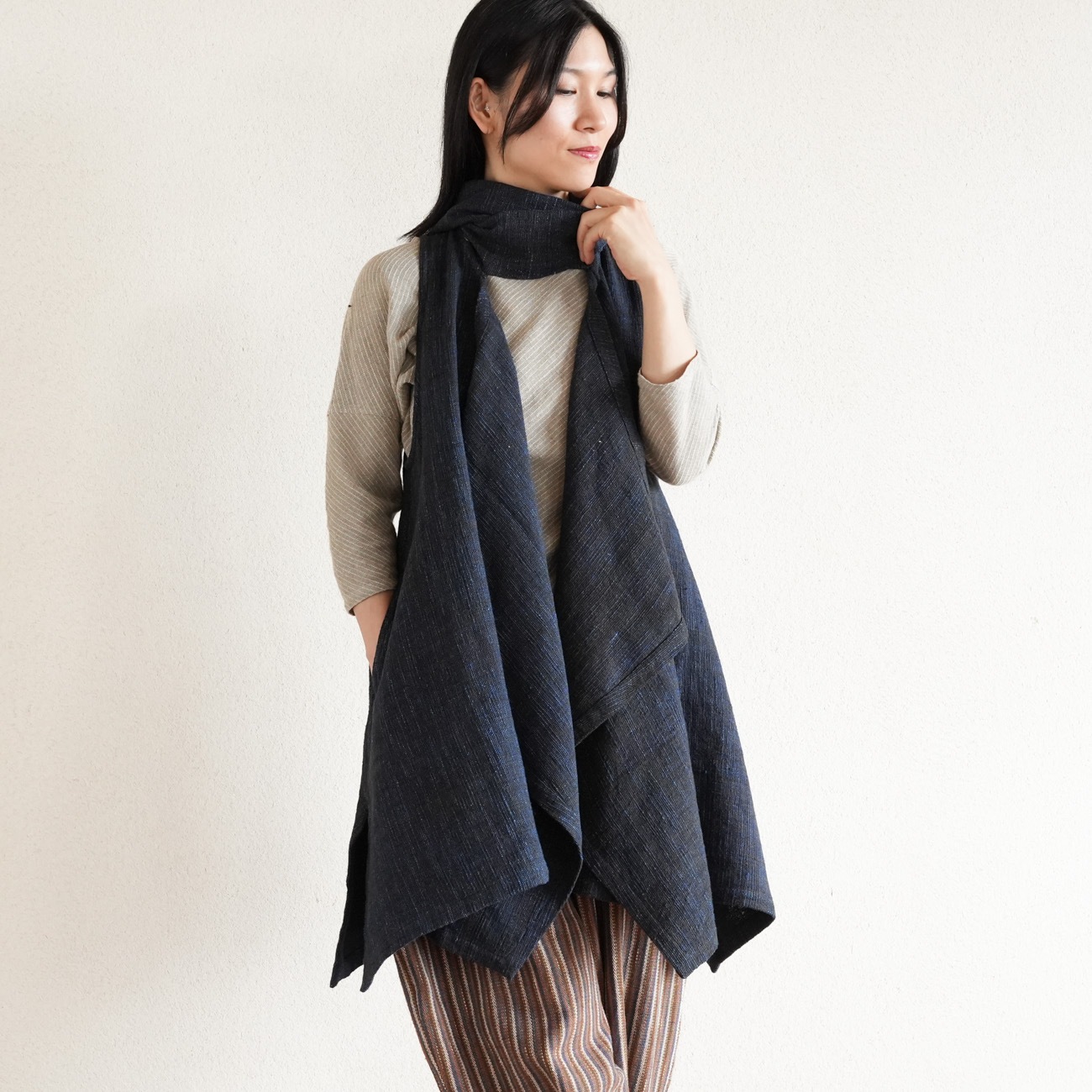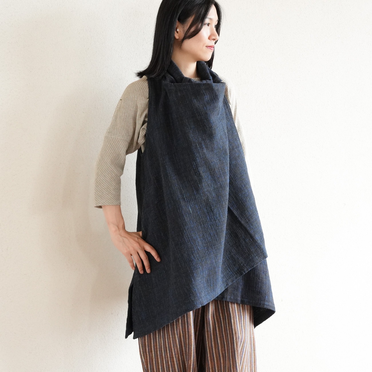 また、織物の生地はほとんど伸縮しませんので、ピッタリではなくゆとりがあるサイズをお選びいただくことをおすすめします。