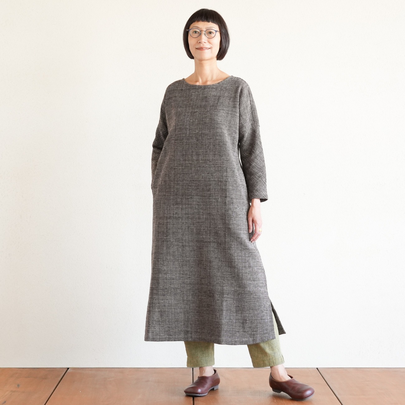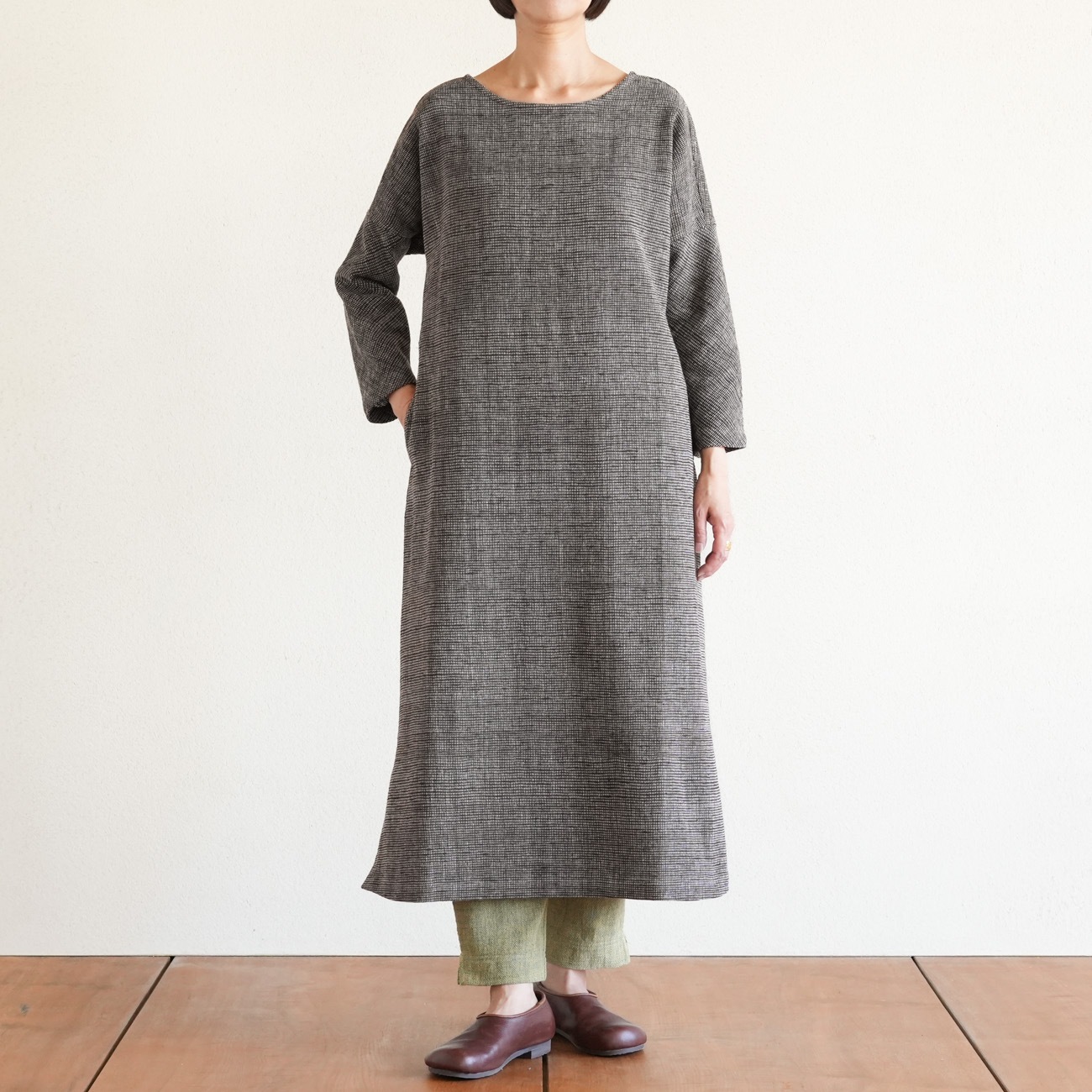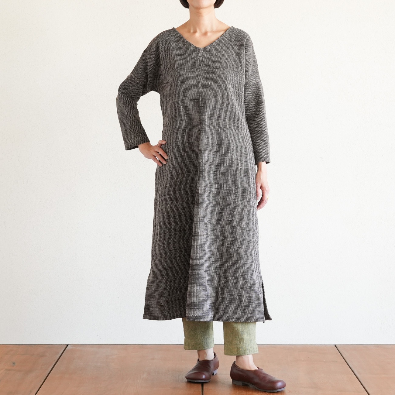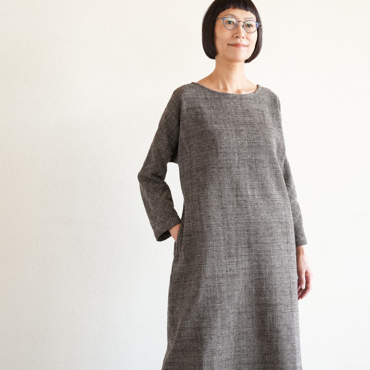 丸首の八分袖ワンピースです。