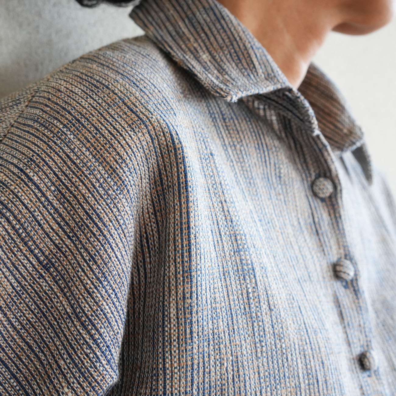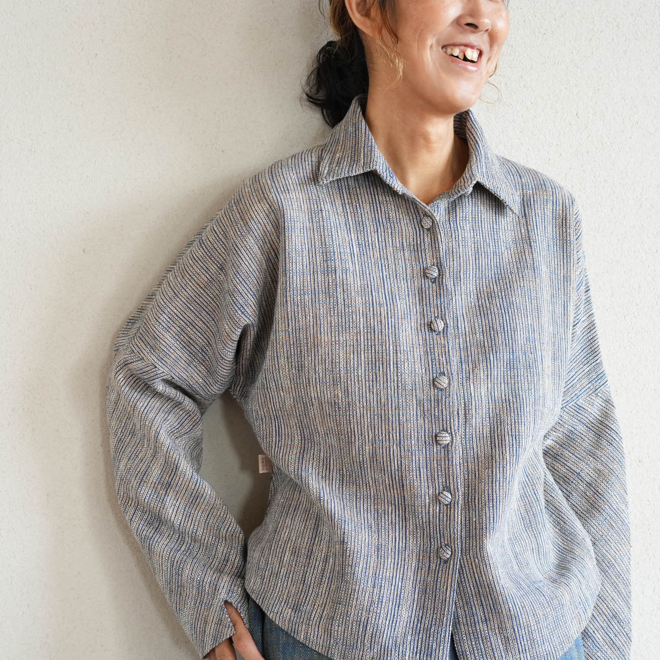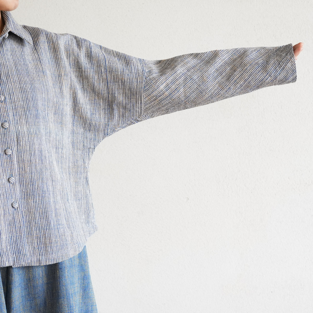 フロントのくるみボタンを閉じてシャツのように着たり