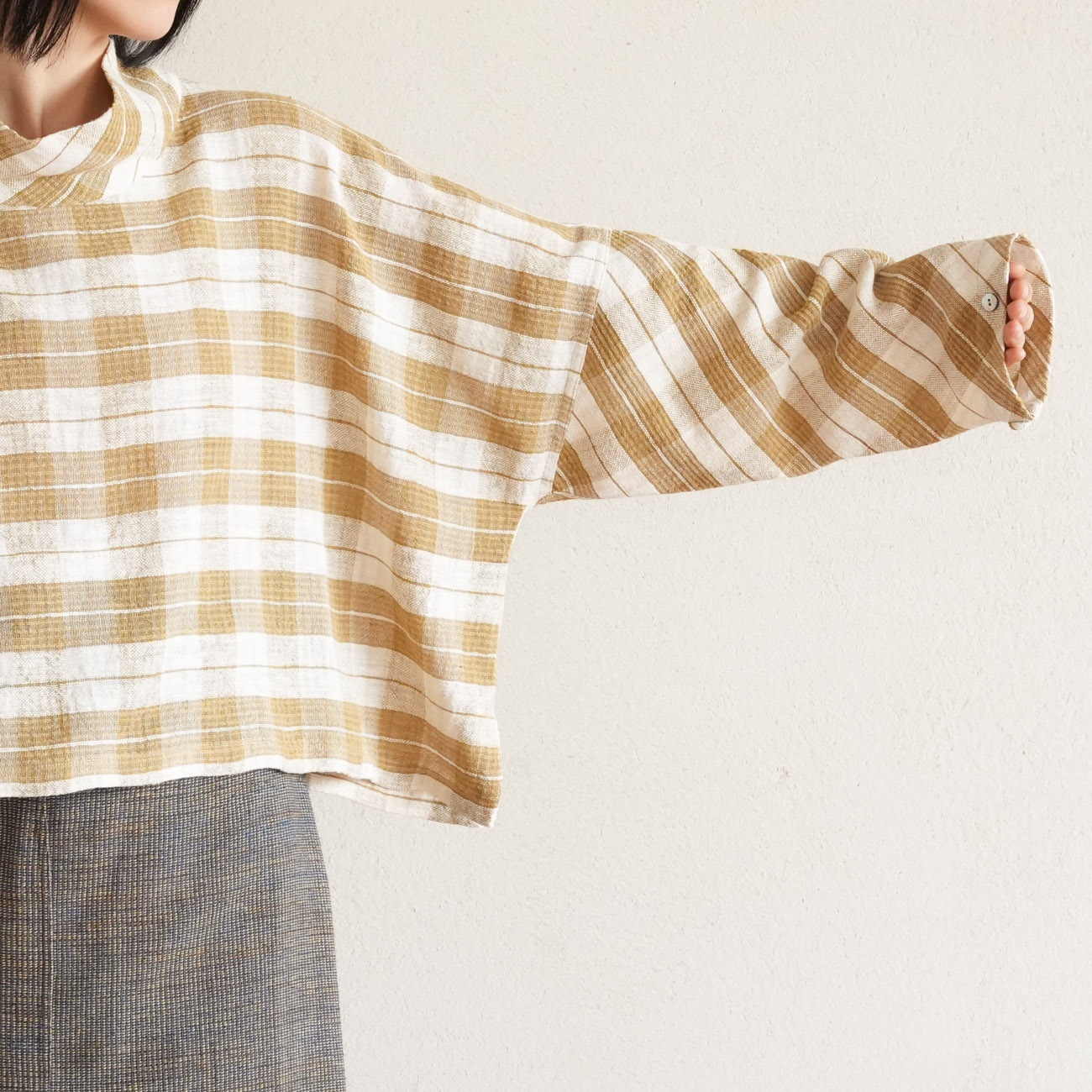 少し長めの袖の先にはボタンがついており