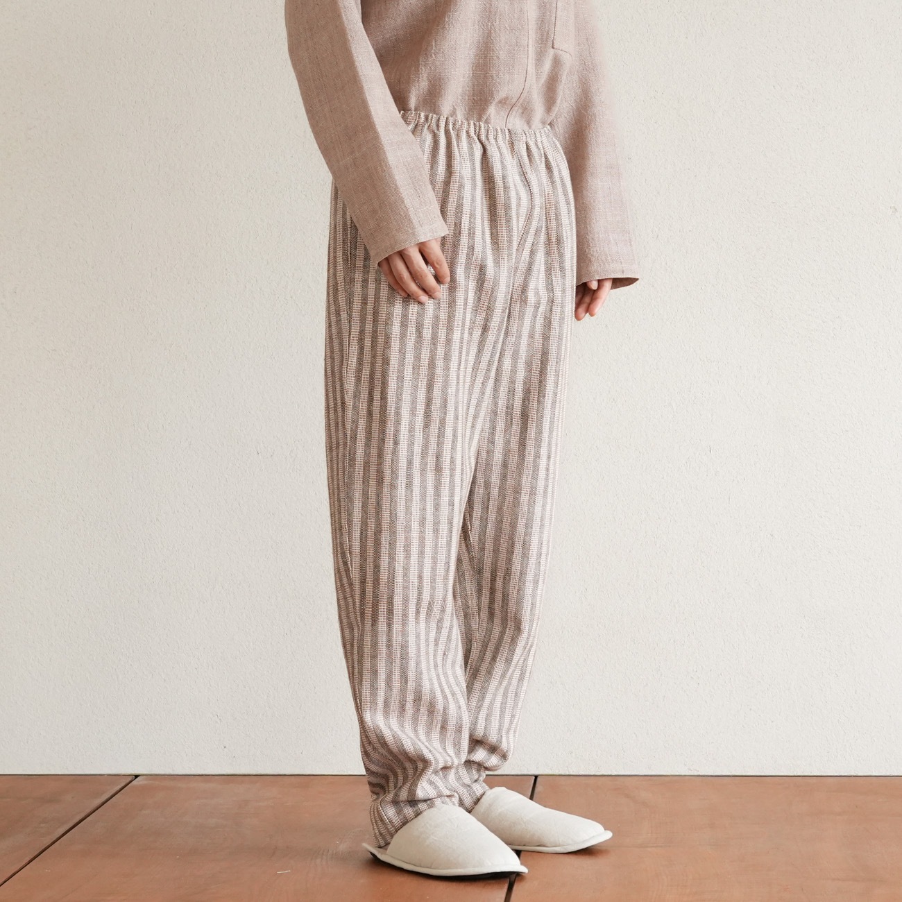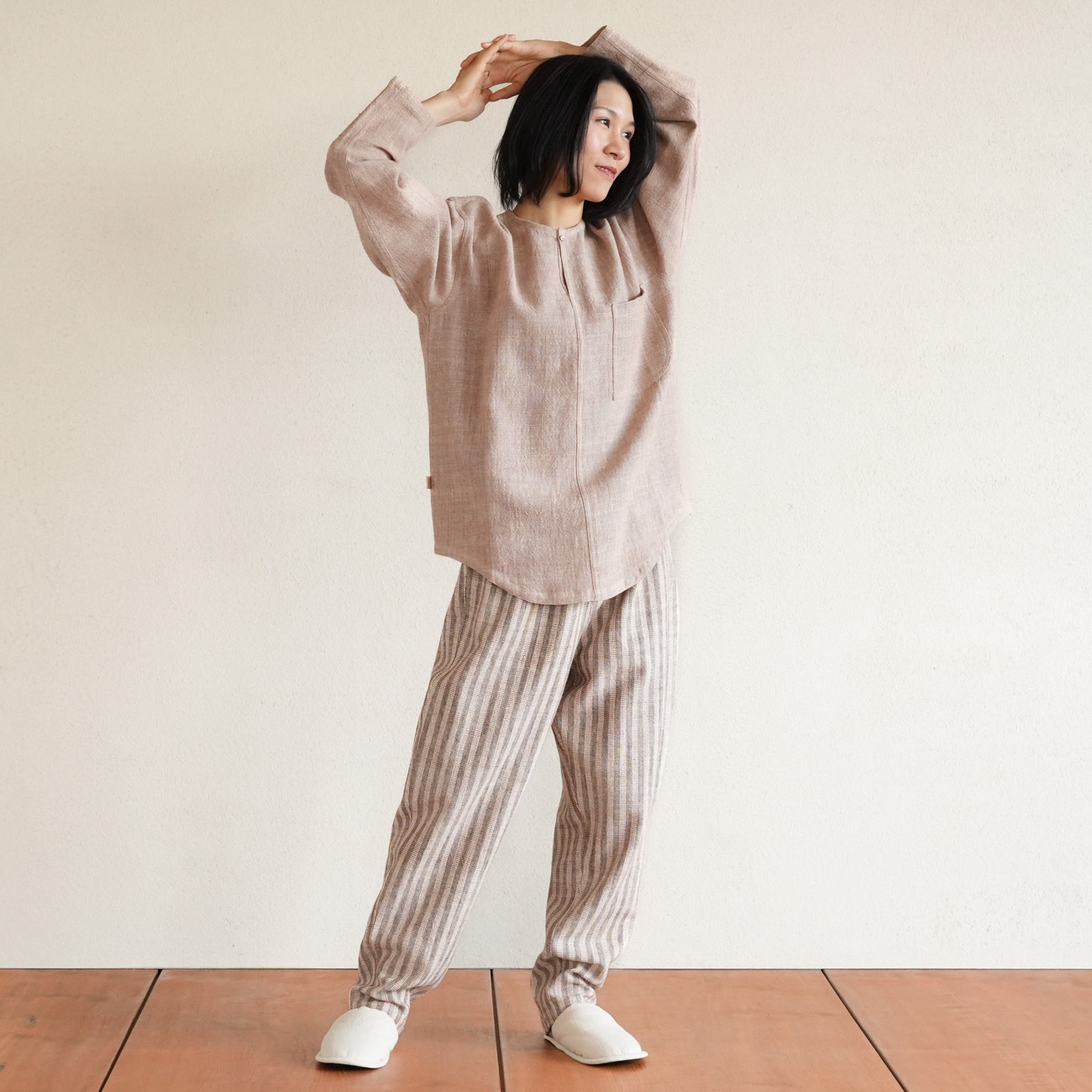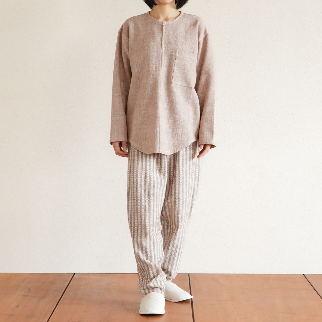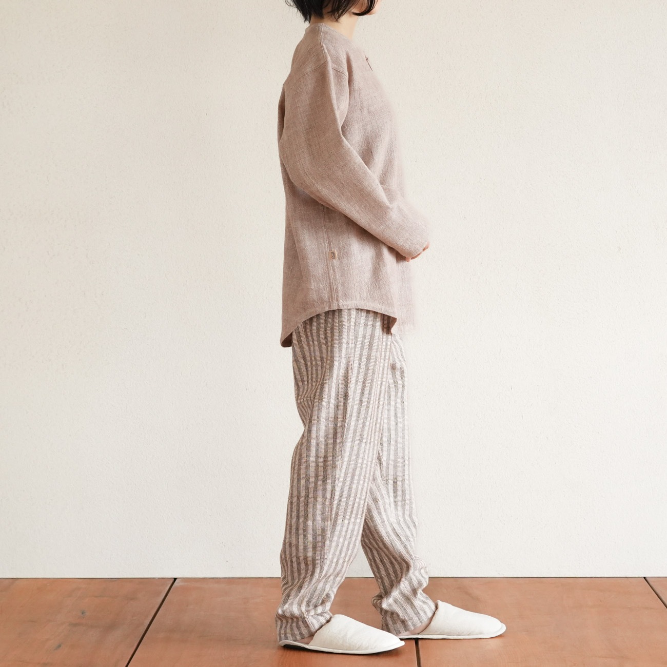 また、織物の生地はほとんど伸縮しませんので、ピッタリではなくゆとりがあるサイズをお選びいただくことをおすすめします。