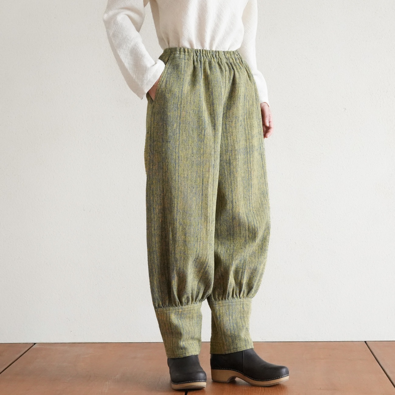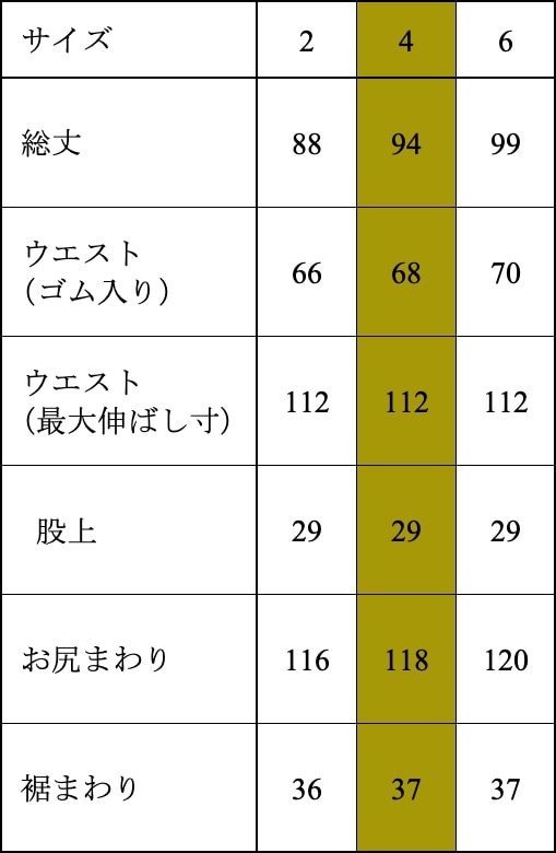 ・ウエスト(ゴム入り)は全く伸ばさずそのままの状態で採寸しています。
