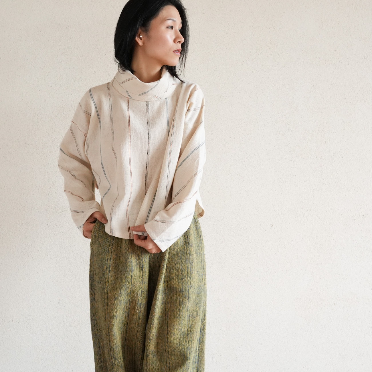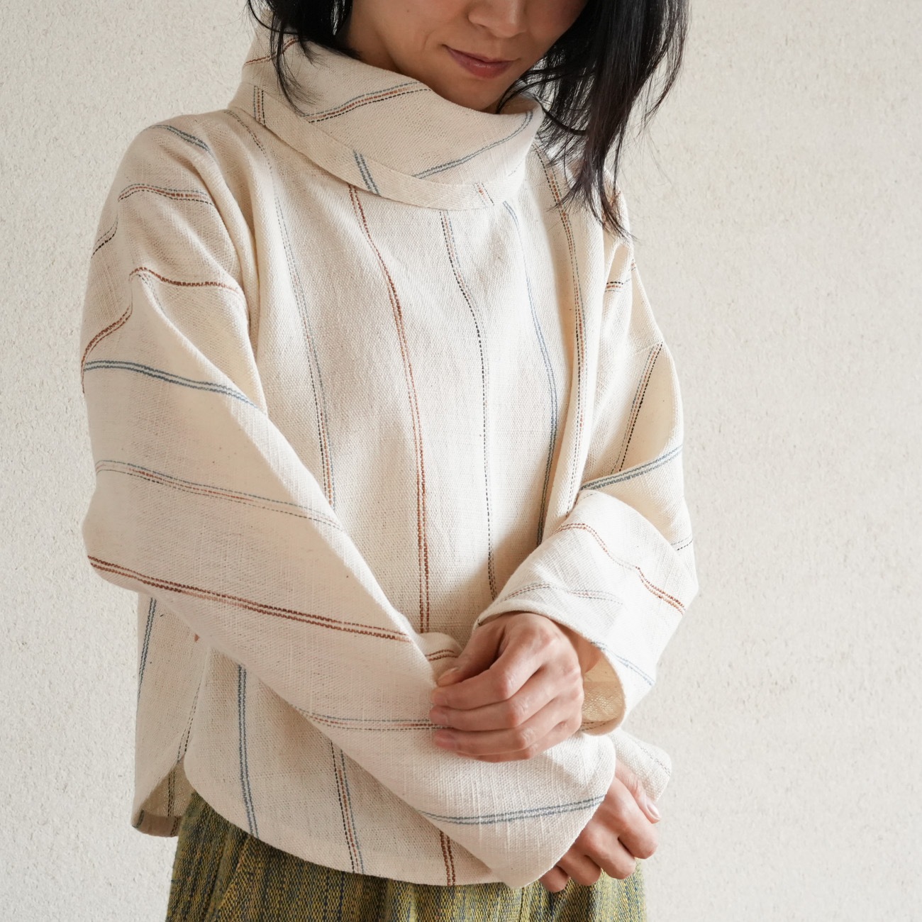 また、織物の生地はほとんど伸縮しませんので、ピッタリではなくゆとりがあるサイズをお選びいただくことをおすすめします。