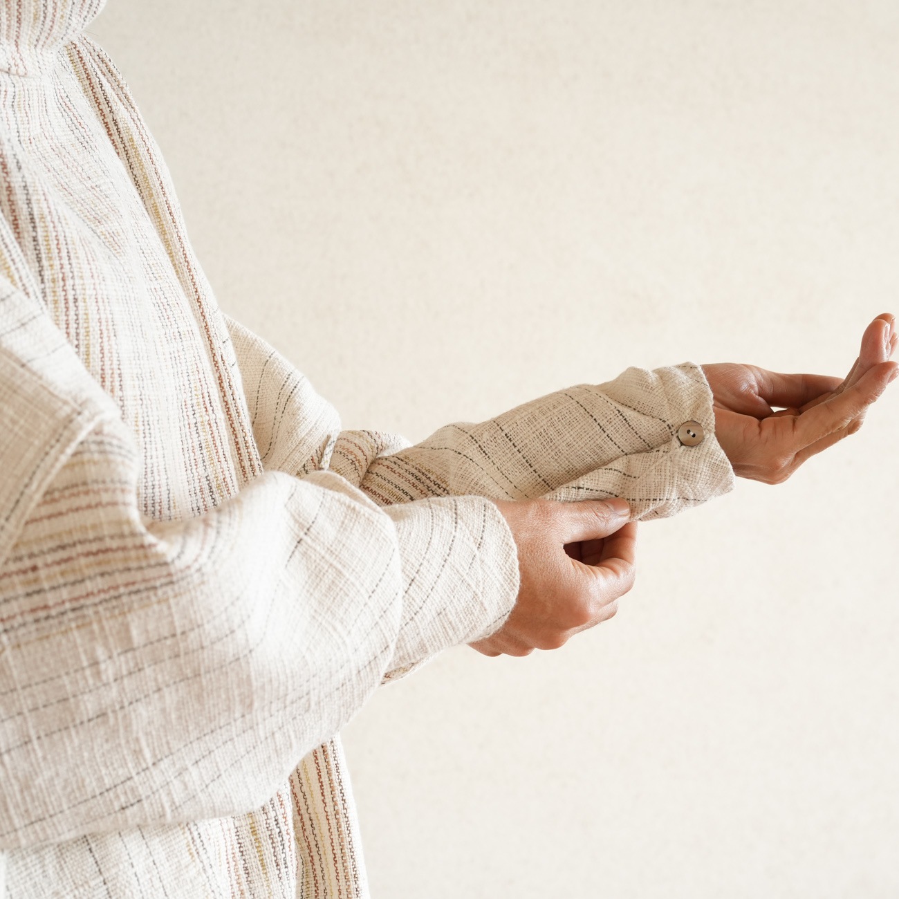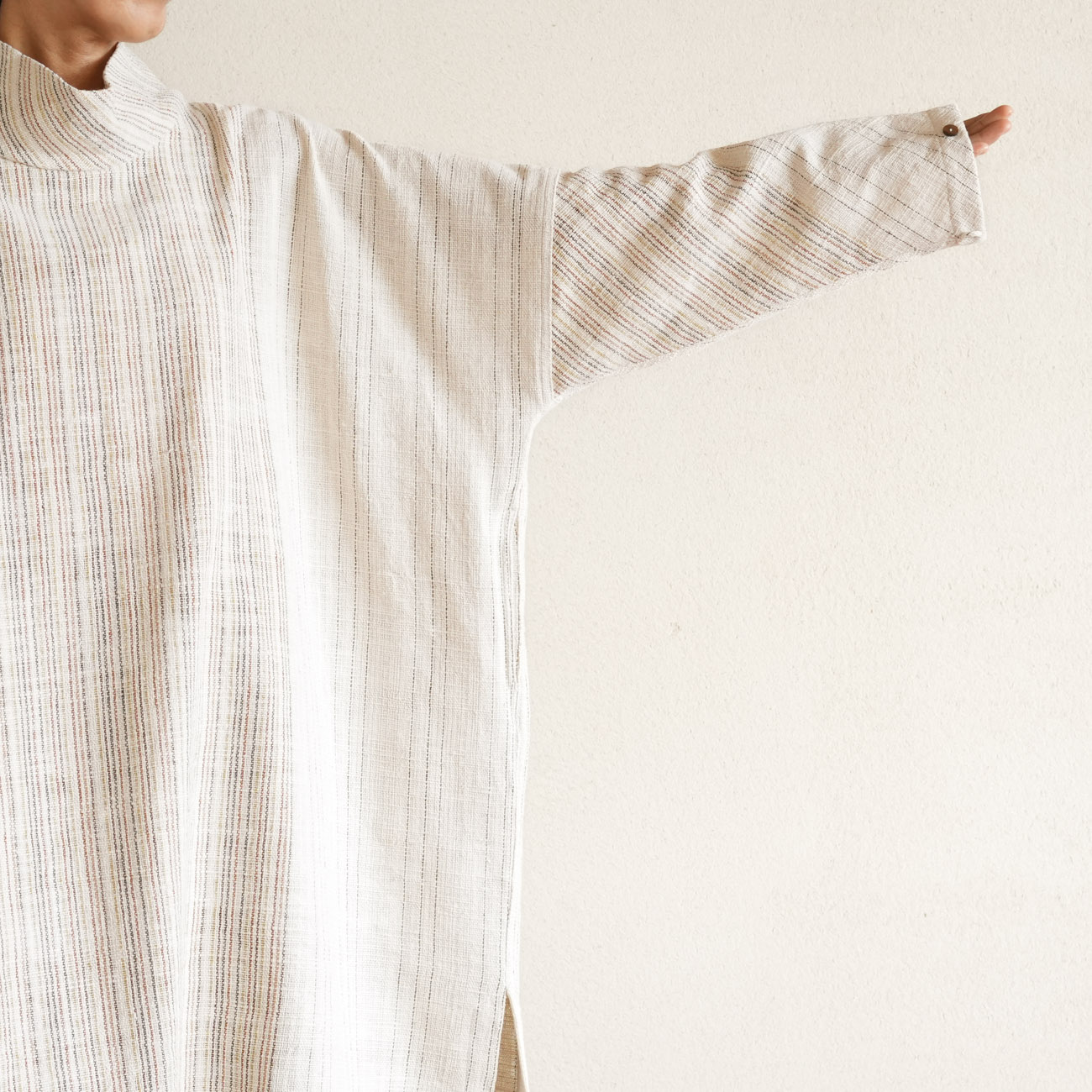 少し長めの袖の先にはボタンがついており